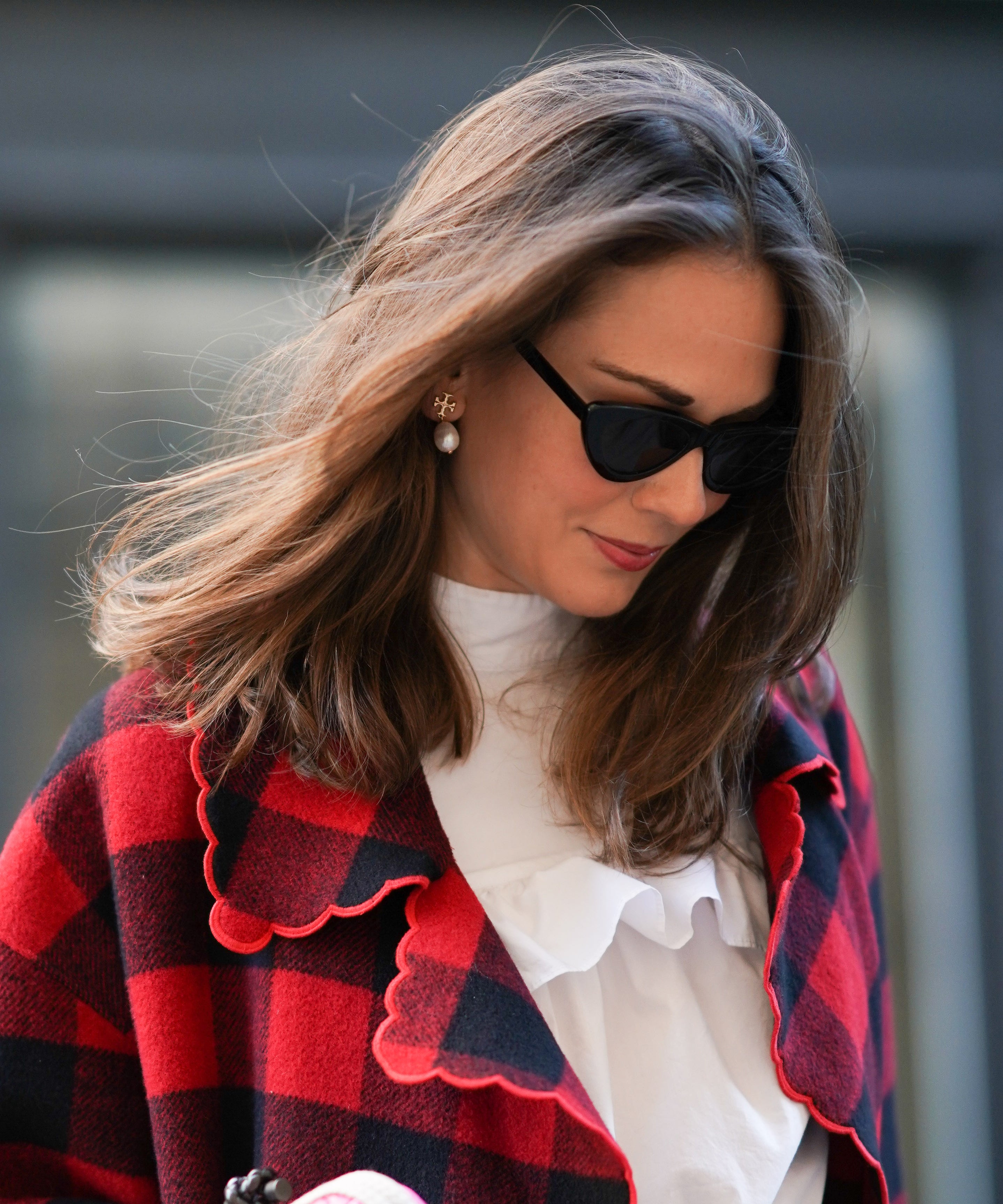 Blonde angled bob with chunk brown lowlights.